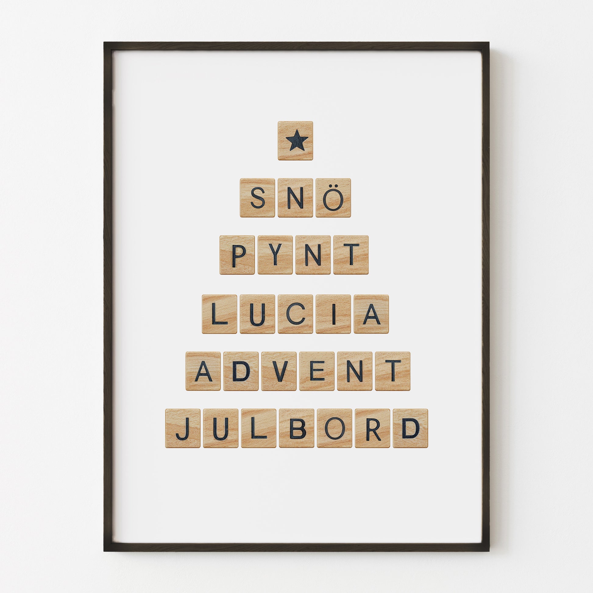 Kom i julstämning med denna unika poster! Orden som för tankarna till julen är skrivna med bokstavsbrickor och bildar en stilren julgran med en stjärna på toppen. Ett enkelt och lekfullt sätt att förhöja julkänslan i vardagsrummet, köket eller hallen. Perfekt som personlig juldekoration – eller som en uppskattad julklapp till någon du håller kär.