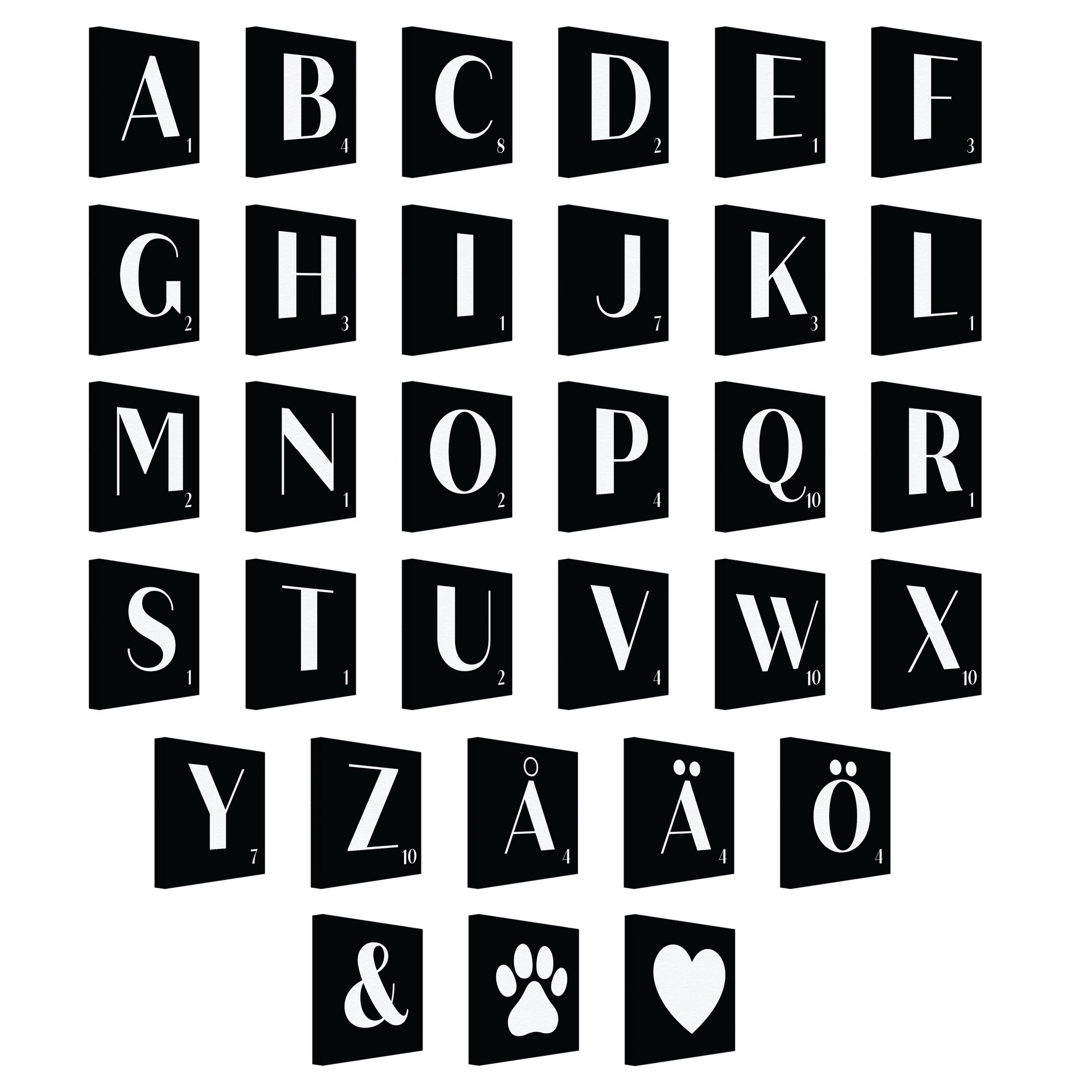 En liten tavla med stor personlighet inspirerad av bokstavsbrickorna från Alfapet och Wordfeud. Perfekt att kombinera flera stycken för att skriva valfritt namn eller ord. Oavsett om du letar efter en personlig present till din ordälskande vän, en namntavla, eller bara en snygg bokstavstavla som unik inredningsdetalj, så har du hittat rätt! Mer än bara en tavla – låt det bli en hyllning till kärlek, familj eller vänskap.