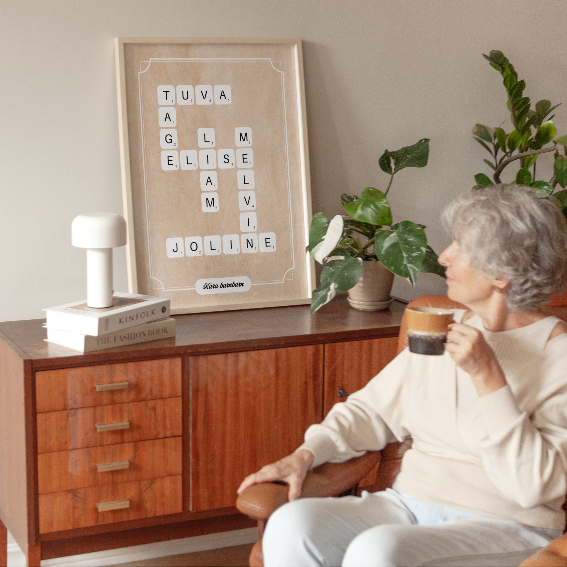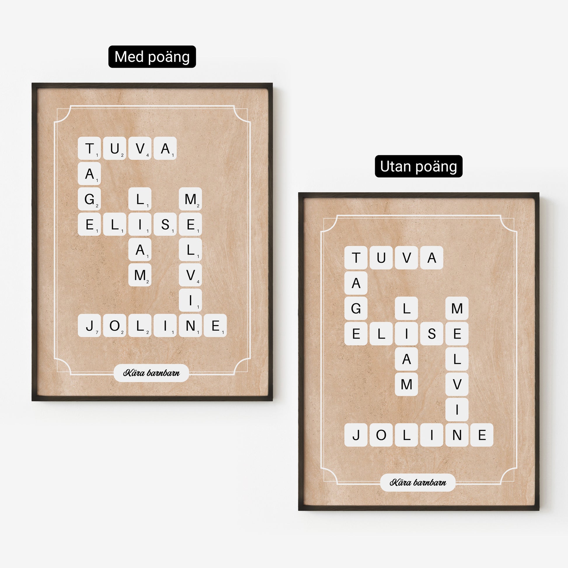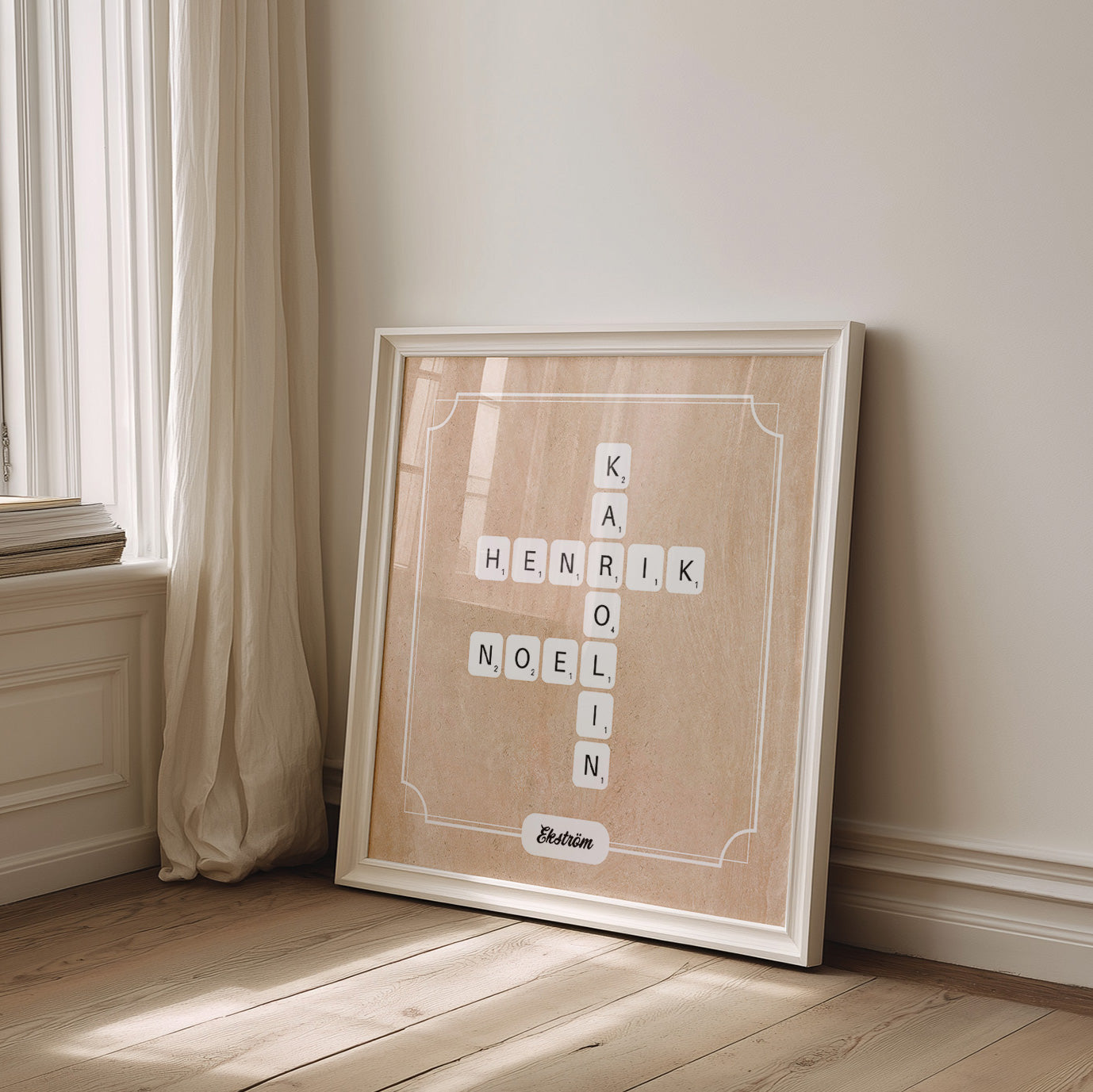 En personlig poster med dina önskade namn/ord sammanflätade i ett korsord med bokstavsbrickor inspirerat av Alfapet och Wordfeud. Ett presenttips vid t.ex. födelse, dop, bröllop, födelsedag och mors/fars dag som ger livets viktigaste minnen och relationer den plats de förtjänar i hemmet.