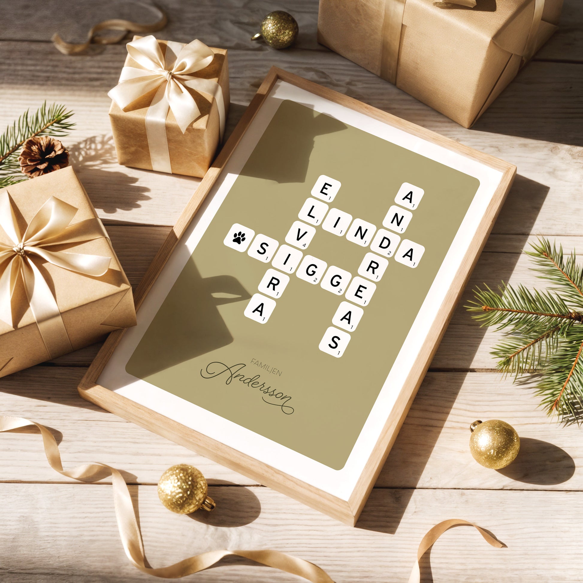 En personlig poster med dina önskade namn/ord sammanflätade i ett korsord med bokstavsbrickor inspirerat av Alfapet och Wordfeud. Ett presenttips vid t.ex. födelse, dop, bröllop, födelsedag och mors/fars dag som ger livets viktigaste minnen och relationer den plats de förtjänar i hemmet.