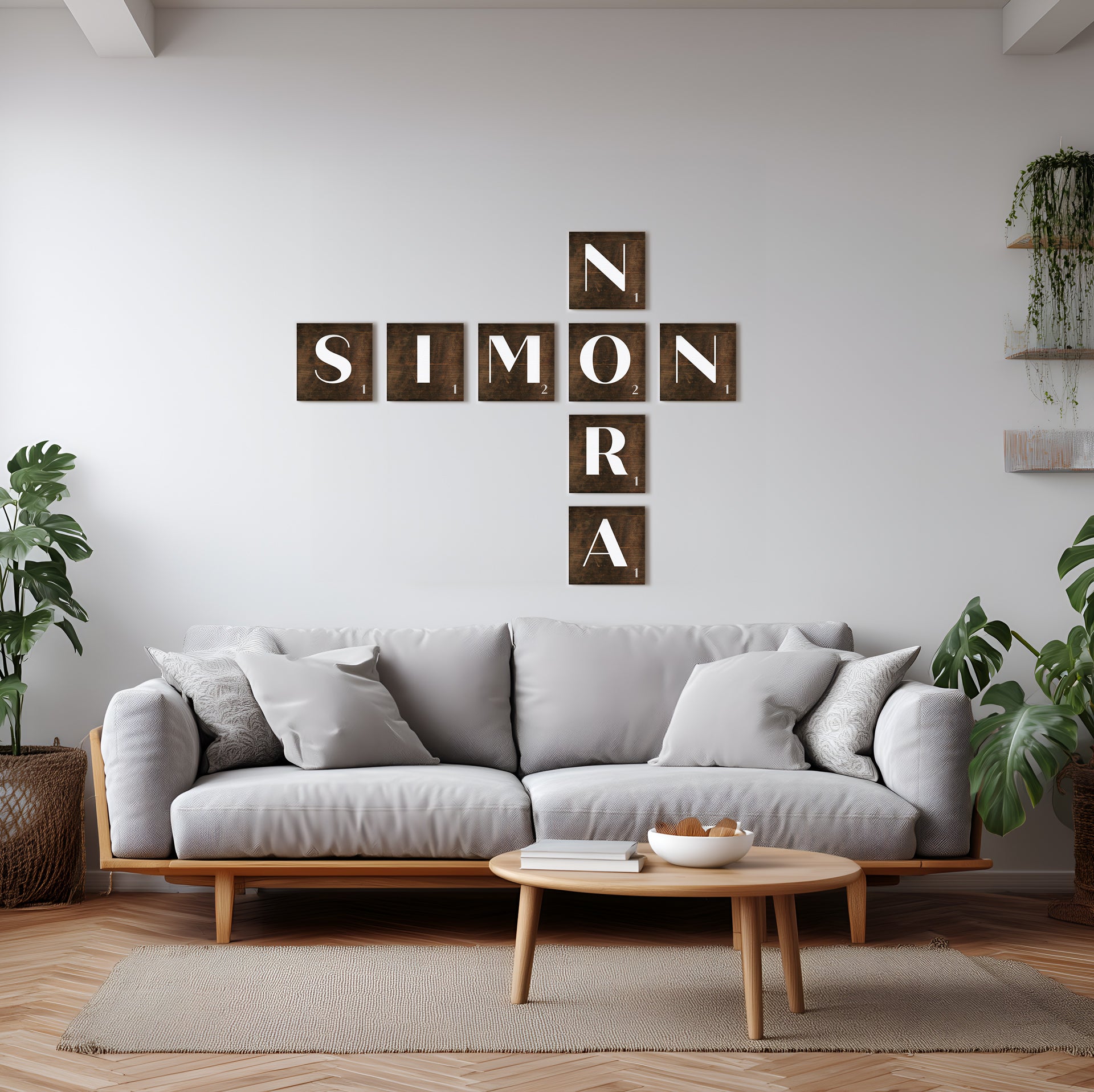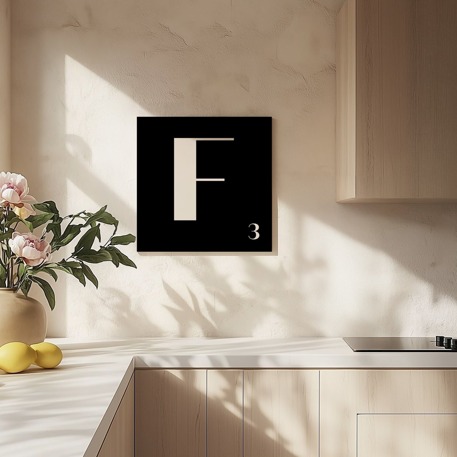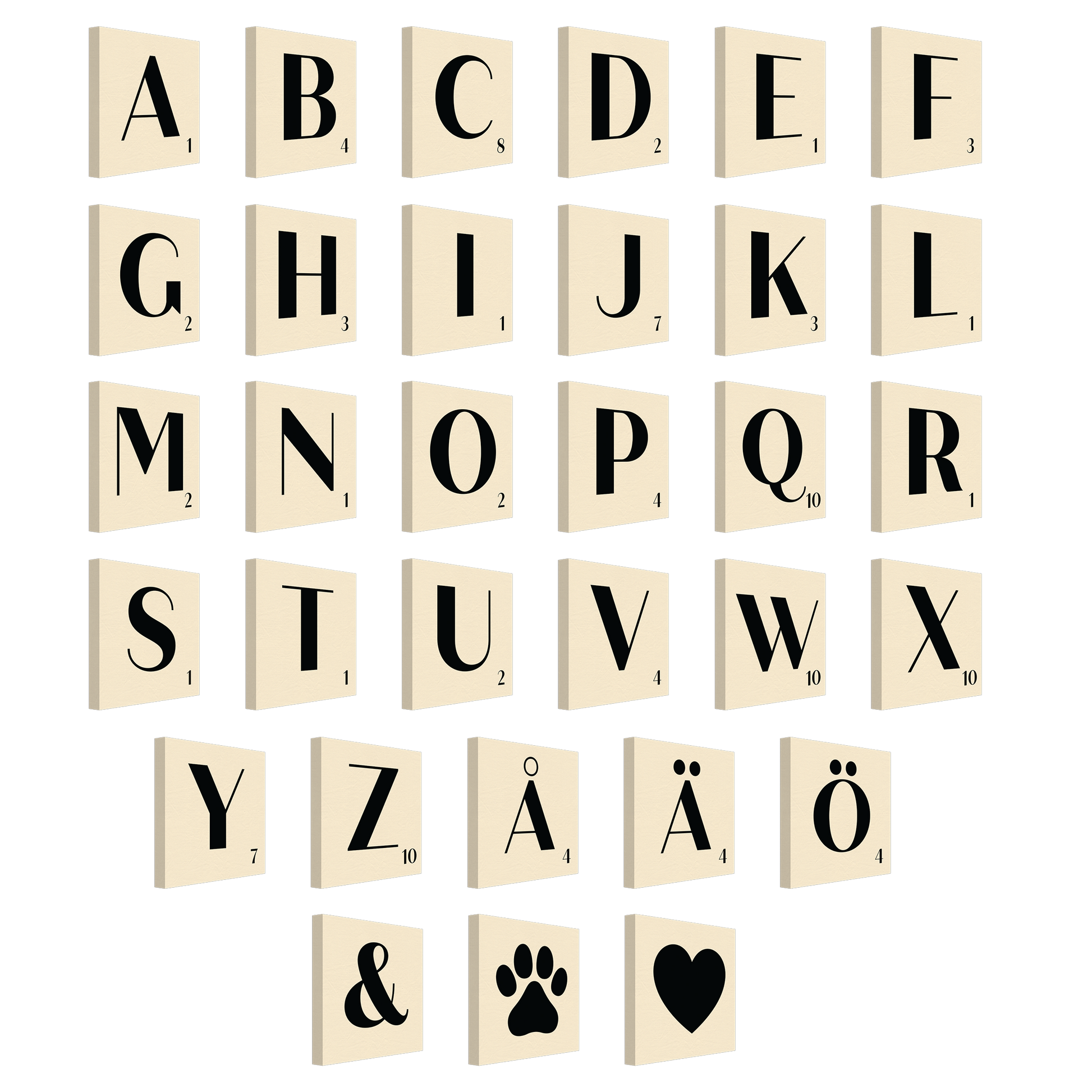 En liten tavla med stor personlighet inspirerad av bokstavsbrickorna från Alfapet och Wordfeud. Perfekt att kombinera flera stycken för att skriva valfritt namn eller ord. Oavsett om du letar efter en personlig present till din ordälskande vän, en namntavla, eller bara en snygg bokstavstavla som unik inredningsdetalj, så har du hittat rätt! Mer än bara en tavla – låt det bli en hyllning till kärlek, familj eller vänskap.